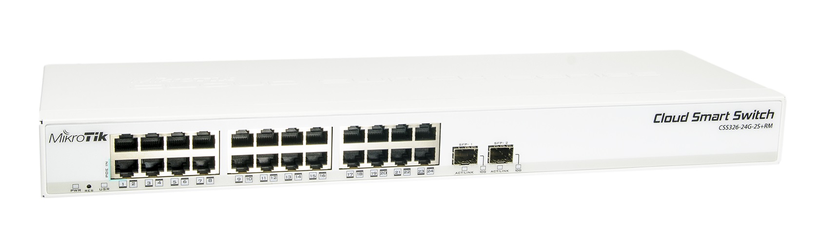 Cloud Smart Switch 326-24G-2S+RM is SwOS powered 24 port Gigabit Ethernet switch with two SFP+ ports in 1U rackmount case that provides wire speed connectivity with several new switching features.