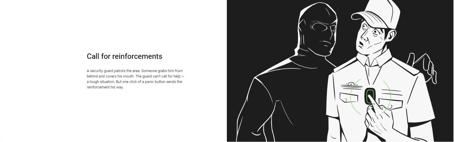 A security guard patrols the area. Someone grabs him from behind and covers his mouth. The guard can’t call for help — a tough situation. But one click of a panic button sends the reinforcement his way