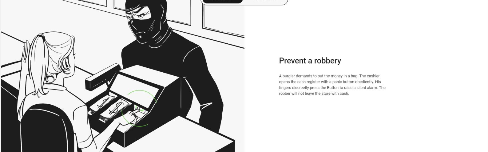 A burglar demands to put the money in a bag. The cashier opens the cash register with a panic button obediently. His fingers discreetly press the Button to raise a silent alarm. The robber will not leave the store with cash