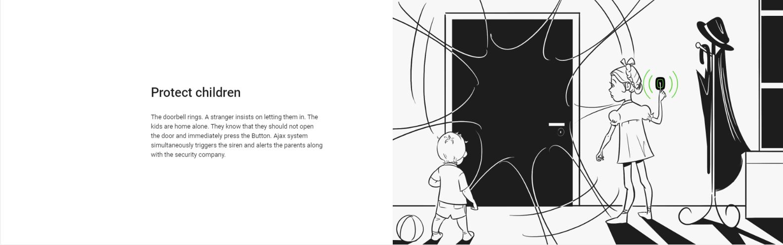 The doorbell rings. A stranger insists on letting them in. The kids are home alone. They know that they should not open the door and immediately press the Button. Ajax system simultaneously triggers the siren and alerts the parents along with the security company