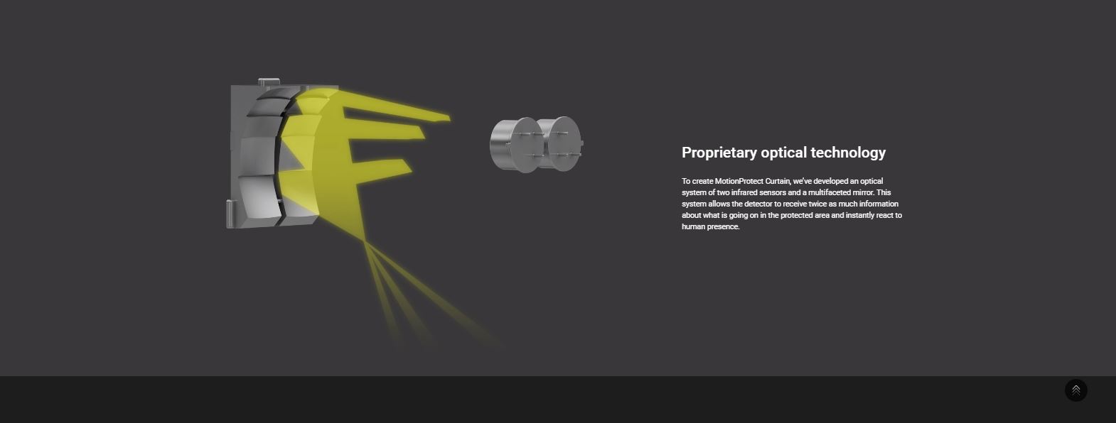 To create MotionProtect Curtain, we’ve developed an optical system of two infrared sensors and a multifaceted mirror. This system allows the detector to receive twice as much information about what is going on in the protected area and instantly react to human presence