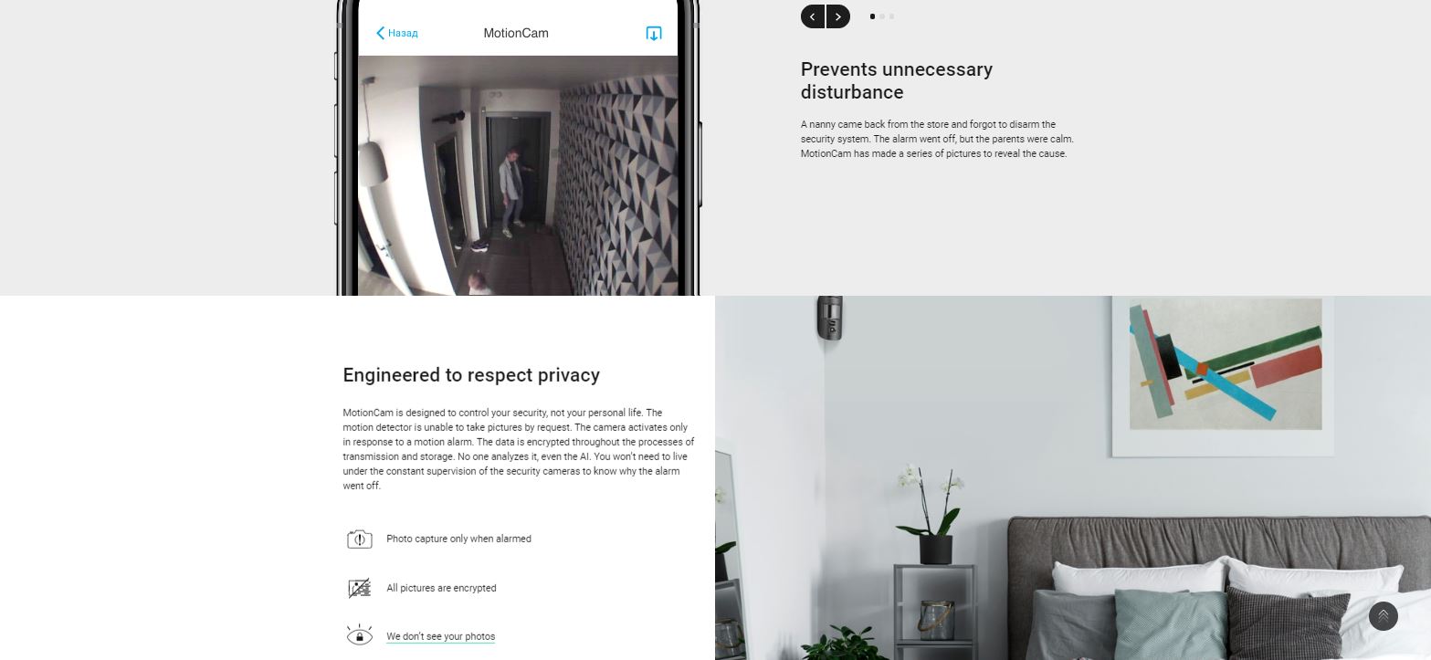 MotionCam is designed to control your security, not your personal life. The motion detector is unable to take pictures by request. The camera activates only in response to a motion alarm. The data is encrypted throughout the processes of transmission and storage. No one analyzes it, even the AI. You won’t need to live under the constant supervision of the security cameras to know why the alarm went off