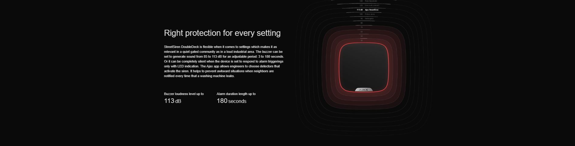 StreetSiren DoubleDeck is flexible when it comes to settings which makes it as relevant in a quiet gated community as in a loud industrial area. The buzzer can be set to generate sound from 85 to 113 dB for an adjustable period: 3 to 180 seconds. Or it can be completely silent when the device is set to respond to alarm triggerings only with LED indication. The Ajax app allows engineers to choose detectors that activate the siren. It helps to prevent awkward situations when neighbors are notified every time that a washing machine leaks