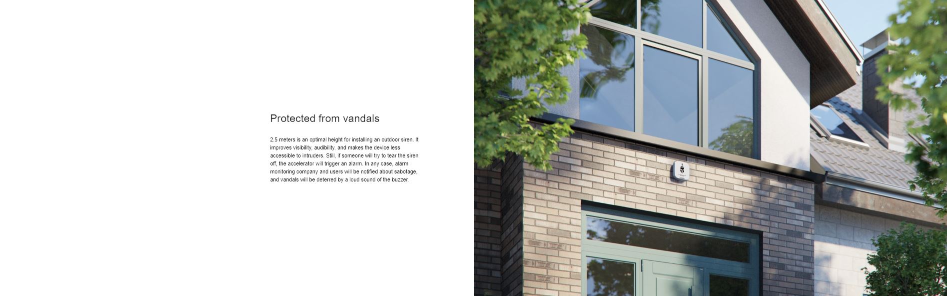 2.5 meters is an optimal height for installing an outdoor siren. It improves visibility, audibility, and makes the device less accessible to intruders. Still, if someone will try to tear the siren off, the accelerator will trigger an alarm. In any case, alarm monitoring company and users will be notified about sabotage, and vandals will be deterred by a loud sound of the buzzer