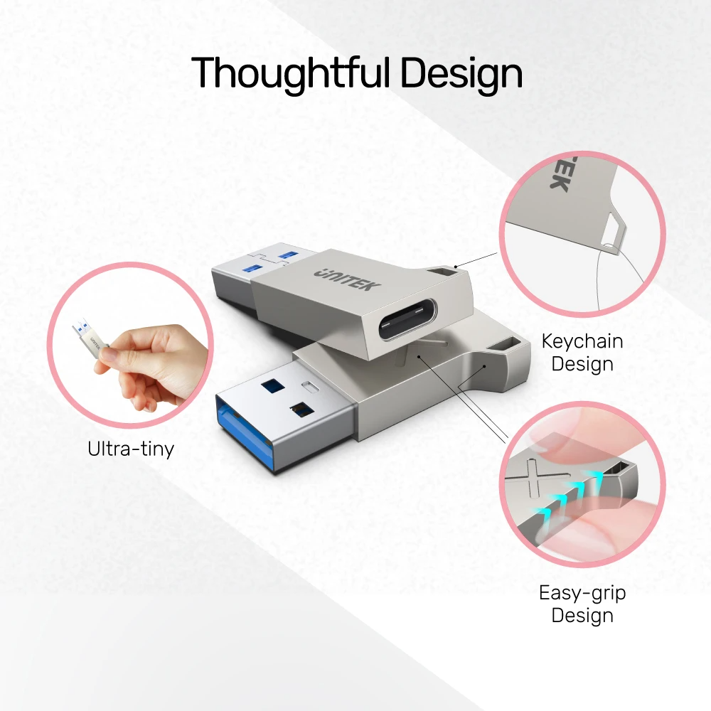 This product is aimed to be an adapter for expanding the compatibility of USB-C connector or cable, including 5Gbps SuperSpeed data sync as well as charging. This adapter is designed with thoughtful keychain which is also an easy-grip design for unplugging, and the zinc-alloy exterior to ensure the strongness and long-lasting usage.