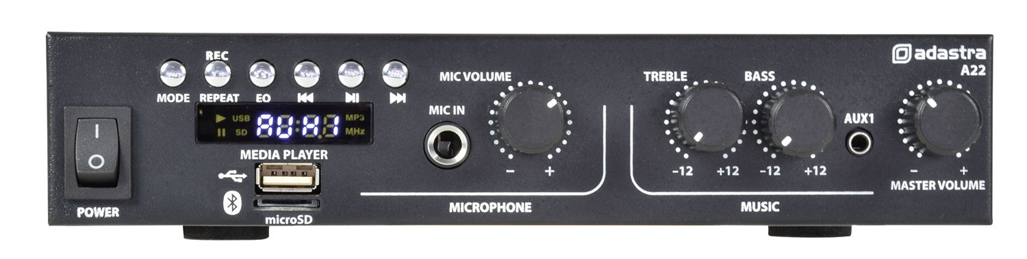 Digital stereo PA amplifier with integral media player in a compact housing. Class-D amplifier section can deliver up to 2 x 55W max. output for background music with a microphone input for announcements or alerts. The media player section can select between USB / microSD mp3 player, FM tuner, Bluetooth receiver, 2 stereo line inputs (rear panel RCA) and another line input on the front panel (3.5mm). Playback can be controlled from the front panel or by the supplied I.R. remote control. Four mounting brackets are provided which enable the A22 to be fitted under a counter top or against a wall for discreet installation. Two A22 units may be mounted side-by-side into a 1U rack space, which can serve smaller peripheral zones in a larger PA installation. Combine with 2 or 4 speaker units for a truly space-saving sound system with comprehensive and easy-to-use functions.