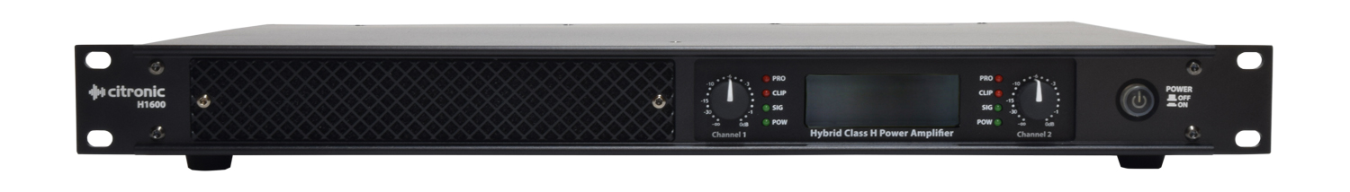 Lightweight power amplifier in a 1U rack-mountable housing for generating high sound pressure levels in medium to large sound reinforcement systems. H-series amplifiers employ a new hybrid class-H architecture, which combines the streamlined efficiency of a digitally controlled power section design with the power delivery and stability of a professional class-AB output stage. Comprehensive internal protection monitors any thermal or overload conditions, automatically mutes at power on/off and provides active inrush limiting. A digital display continually shows the supply voltage, internal temperature and output level. A fully balanced signal path has 3 switchable input sensitivity levels to match different audio sources and the amplifier section can be set to operate in Stereo, Parallel or Bridge modes. Speaker outputs can be connected using 1 or 2 Speakon leads as required. H-series amplifiers provide immediate and dynamic power on demand for sound contractors and PA installers that need dependable service with optimum sound quality.