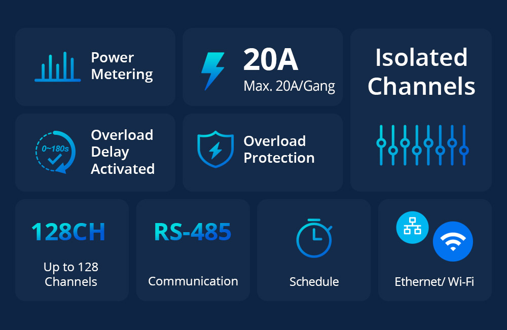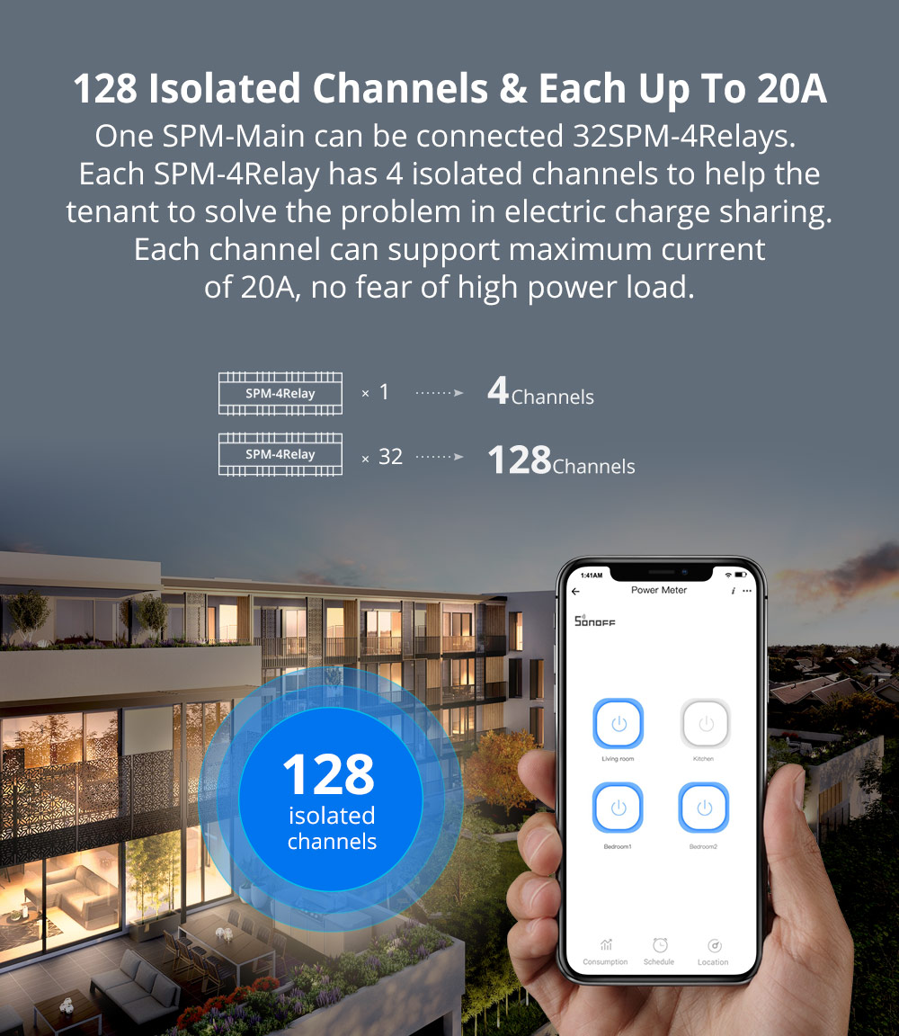 Connect up to 32 SPM-4Relays.One SPM-Main can be connected 32 SPM-4Relays. Each SPM-4Relay has 4 isolated channels to help you manage devices more conveniently