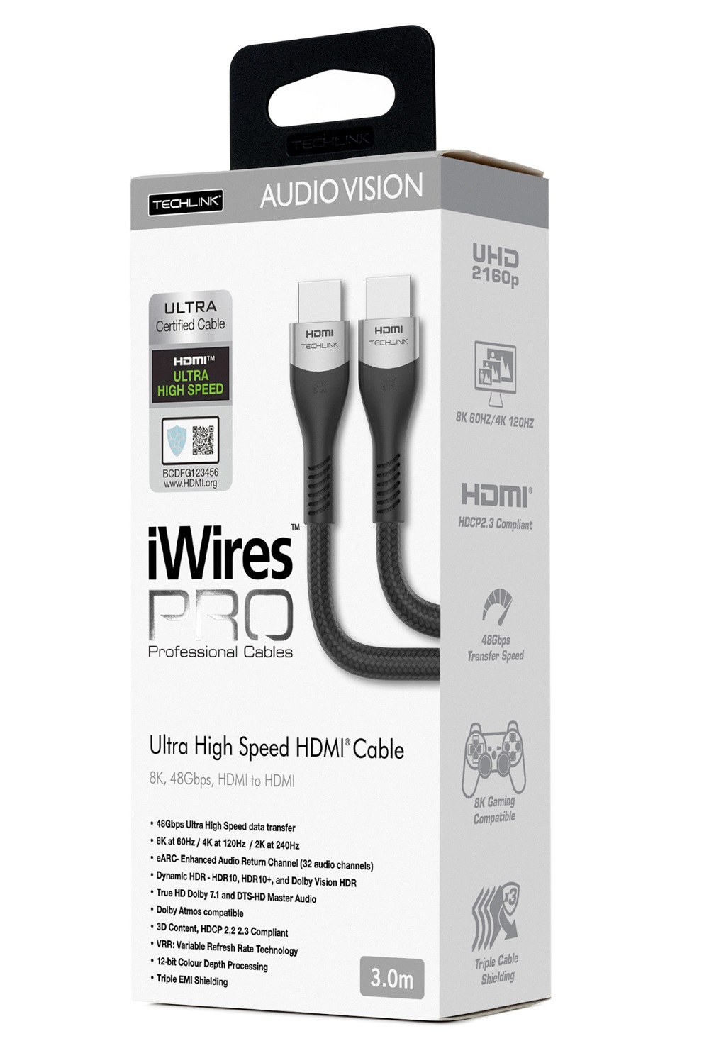 Introducing the Techlink iWires PRO 8K HDMI ULTRA Certified Cable, nickel-plated HDMI connector, PP yarn braided jacket, 144 strand aluminium shielding layer, coverage rate up to 95% in line with the association's EMI -6db standard, supports 4K@120HZ, 8K@60HZ resolution.