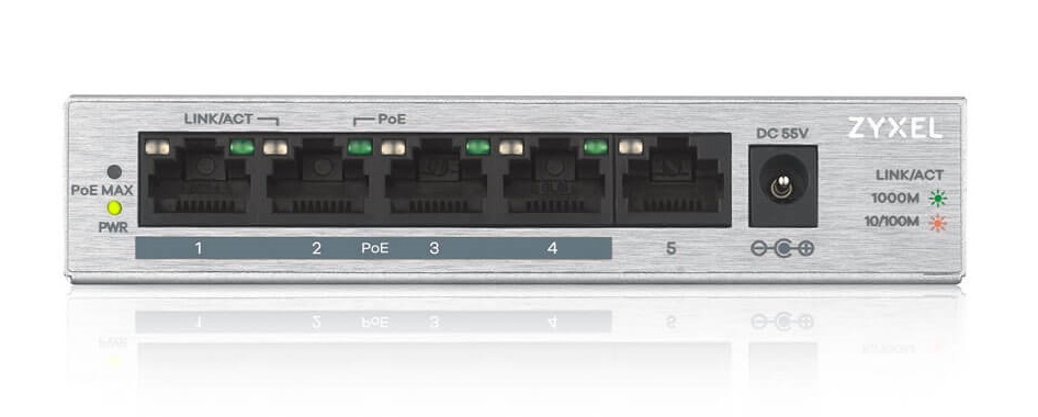The Zyxel GS1005HP GbE Unmanaged PoE Switch is equipped with 5 Gigabit Ethernet ports, 4 of which are PoE ports that can deliver up to 60 w of total PoE budget. The GS1005HP can easily connect