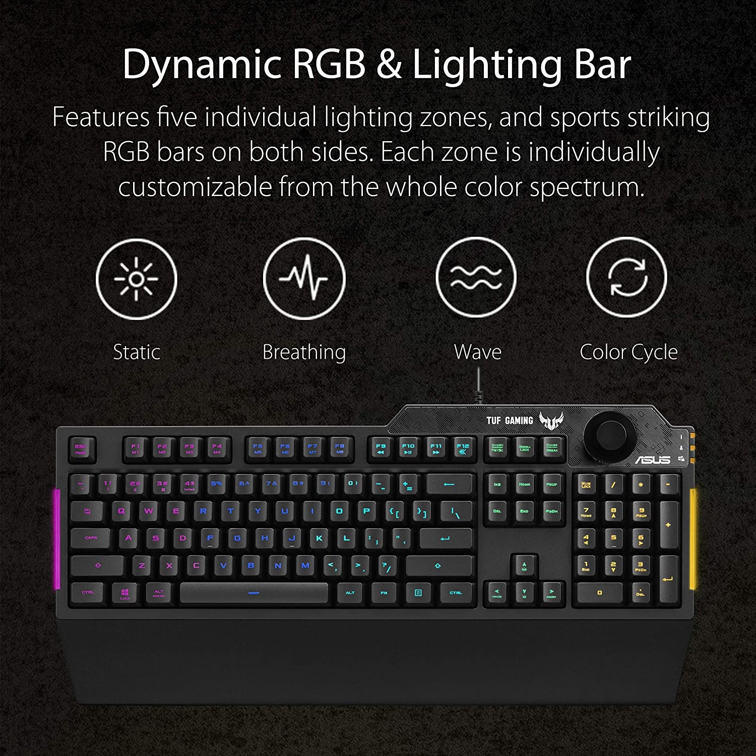• DESIGNED FOR COMMITTED GAMERS - TUF K1 keyboard features 5 individual lighting zones & striking RGB bars on the sides, with ASUS Aura Sync & latest Armoury Crate software support for centralized controls, and synchronized game profiles & lighting