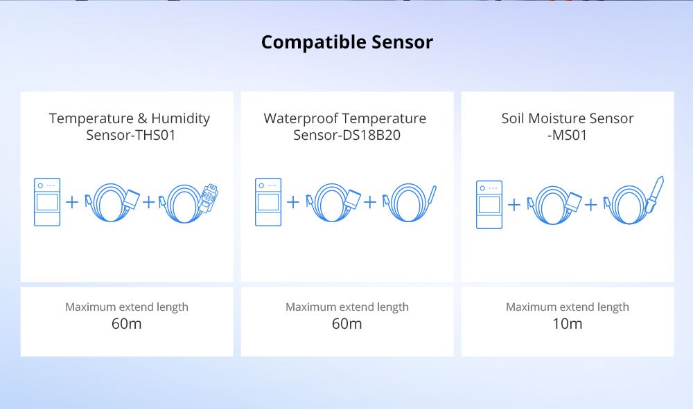 Extend Distance : THS01, DS18B20 can be extended to 60M, and MS01 Soil Moisture Sensor can be extended to 10M