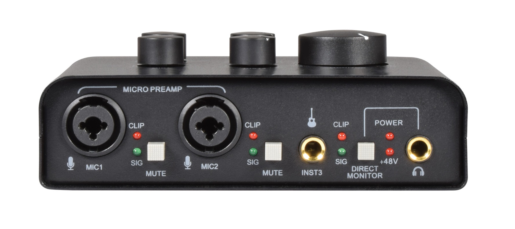 Desktop USB soundcard for a computer-based recording studio. Featuring 2 independent microphone inputs on XLR/jack sockets and a separate 6.3mm instrument input. Each input has a gain control and there is an optional echo effect with deparate control. Monitoring is via a stereo 6.3mm headphone jack or L+R RCA line output on the rear of the unit for connecting monitor speakers. Power to the interface and two-way digital audio is connected via a USB type-C socket at the rear. Simple yet versatile operation for project studios and DAW recording setups.