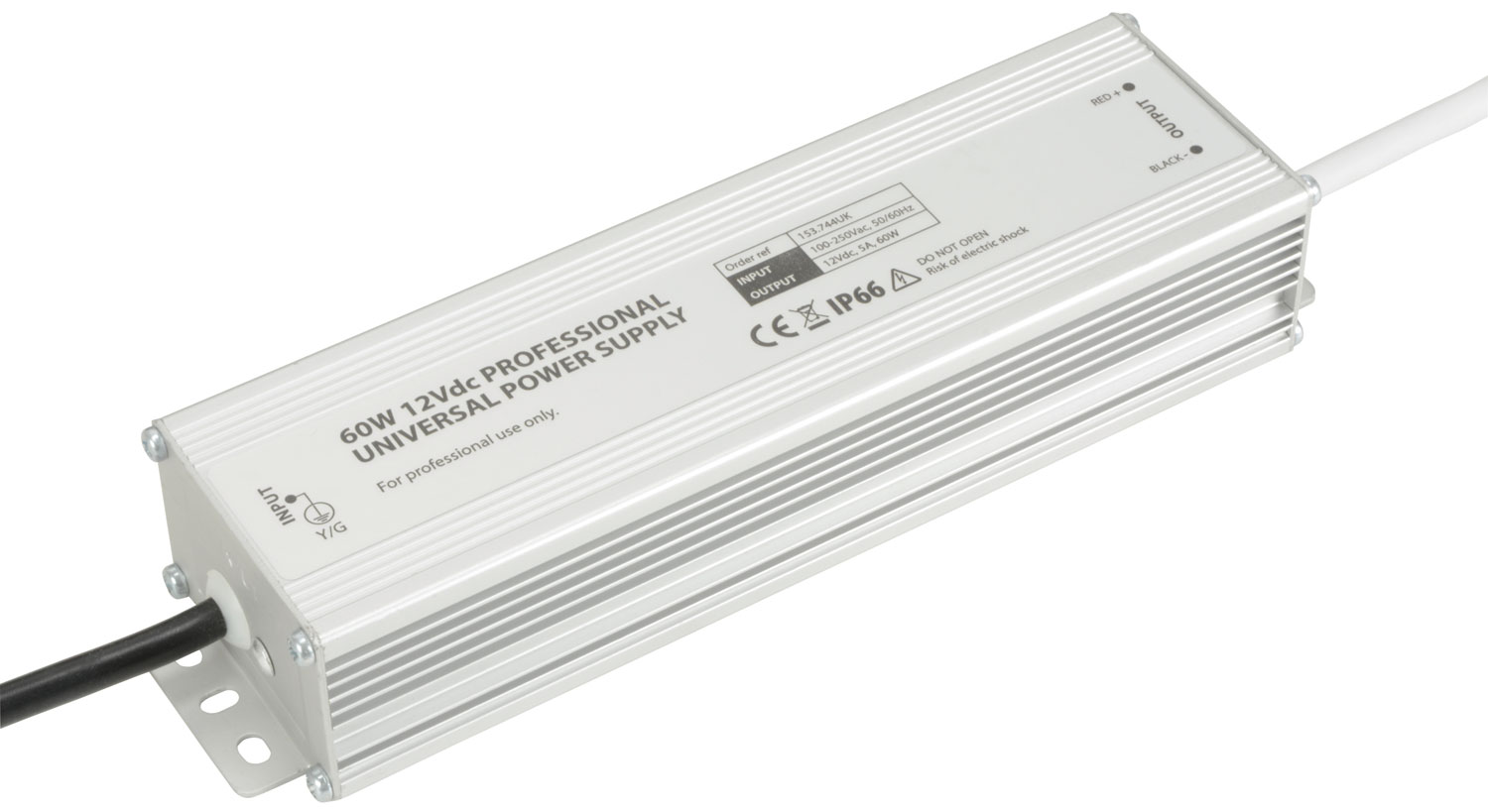 IP67 rated 12Vdc power supply, suitable for both indoor and outdoor LED Tape & lighting installations. For professional use only.