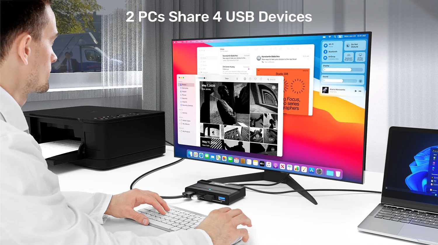 UNITEK 2 in 4 out USB 3.0 KVM switch supports 2 computers to share 4 USB devices like keyboards, mouses, U disk, printers, scanners, USB cameras, headphones, etc. It's convenient for you to switch freely between your work computer and personal computer, greatly improving work efficiency.UNITEK 2 in 4 out USB 3.0 KVM switch supports 2 computers to share 4 USB devices like keyboards, mouses, U disk, printers, scanners, USB cameras, headphones, etc. It's convenient for you to switch freely between your work computer and personal computer, greatly improving work efficiency.