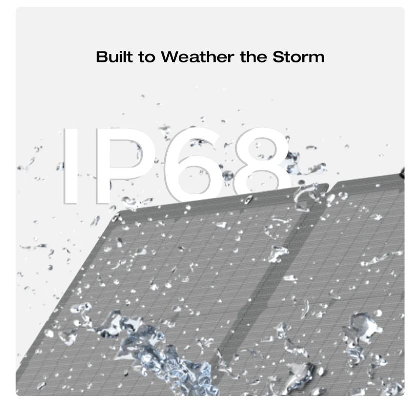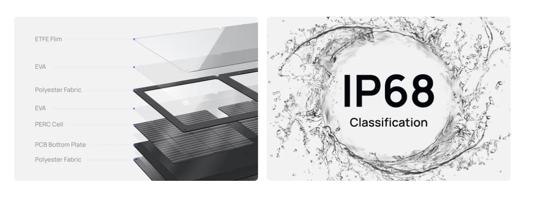 - Our 60W portable solar panel is built to withstand a range of environments, from humid and wet to dry and dusty. With a high IP68 waterproof rating and a protective ETFE film, the solar cells continue to collect energy even during downpours