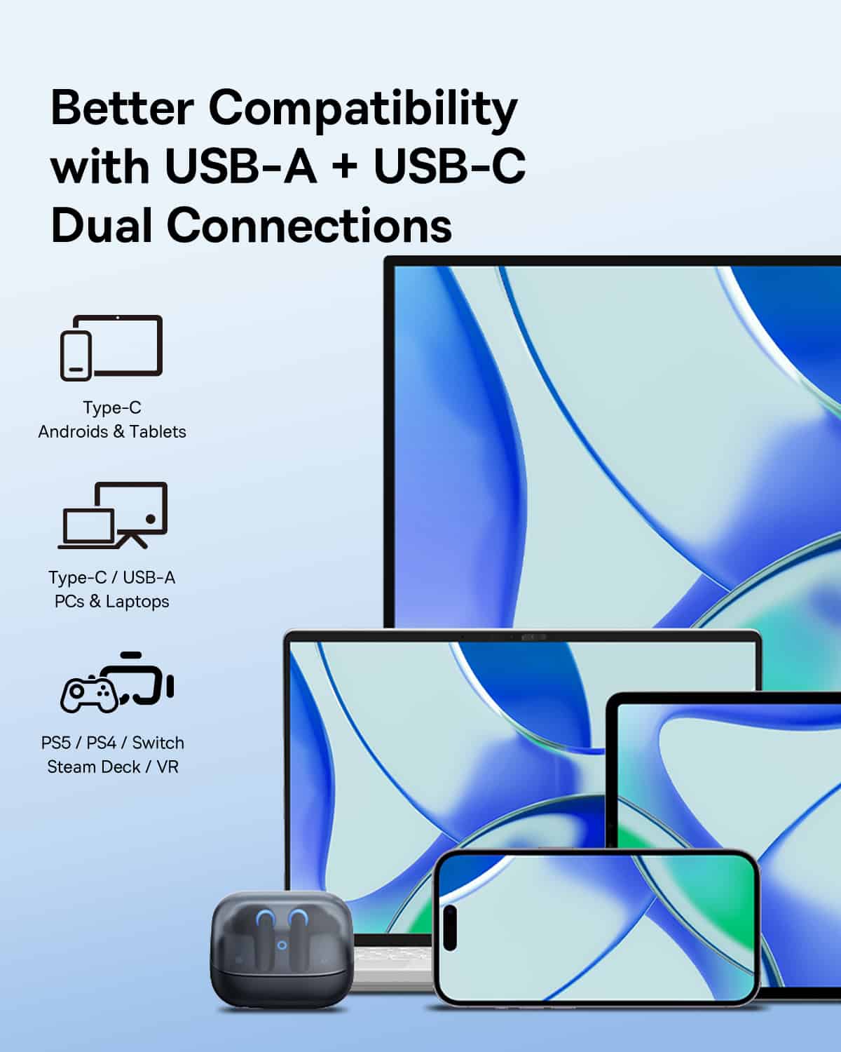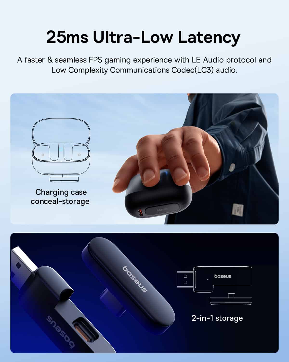 Stable connection The Baseus AeQur G10 headphones use Bluetooth 5.3 technology to ensure a reliable and high-quality connection to your devices. In addition, you'll find a USB-C/ USB-A adapter in the case, allowing you to seamlessly connect to devices equipped with this port without the need for Bluetooth.
