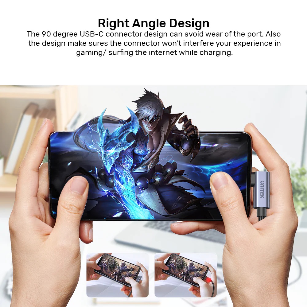- Right Angle Design: The 90 degree USB-C cable connector design can avoid wear of the port. Also the design make sures the connector won’t interfere your experience in gaming/ surfing the internet while charging.