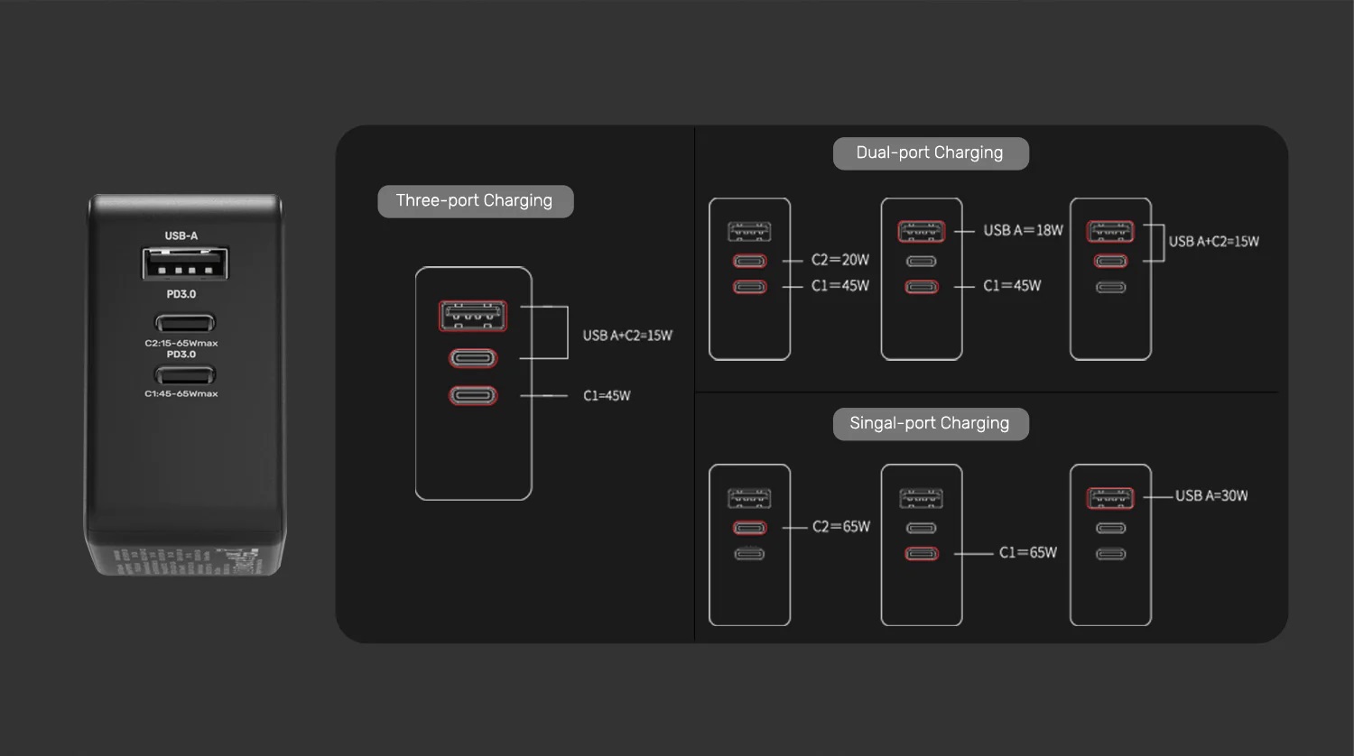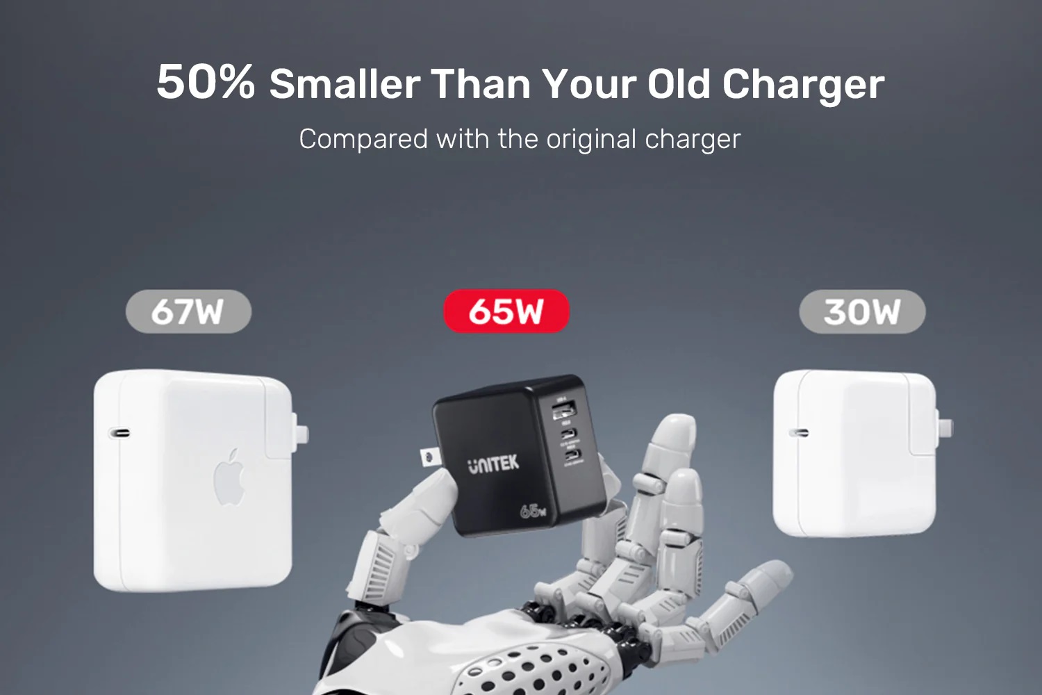The Unitek 65W charger with 2 x Type-C PD Fast Charging Ports (Max 65W) and 1 x USB A QC 3.0 charging Port (Max 30W).Charges up to 3 devices simultaneously.