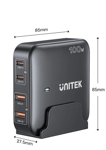 Slim and Compact 4-port GaN Charger with stand. UNITEK latest GaN III technology brings super charging performance and safety to this charging station. At the same time, it has slim and compact design. You can get a high-speed charging experience anywhere. Say goodbye to old, bulky chargers.