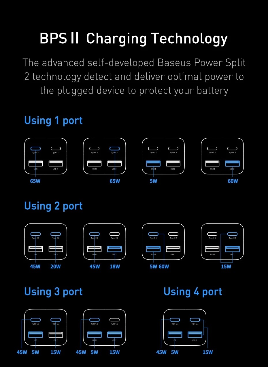 Compact design Thanks to the new GaN3 technology, the Baseus 65W desktop charger is 10% smaller than its predecessor and measures only 2.57in*1.58in*1.45in to meet the requirements of business trips, travel, home and offic