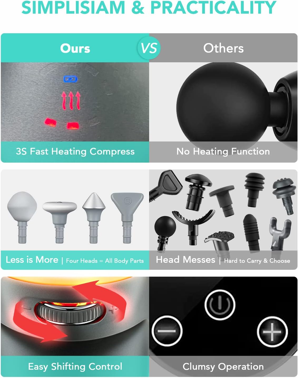 USER FRIENDLY DESIGH FOR ZERO BURDENS: This massager gun is designed with a color indication system, which shows the massage or heating mode; The roller variator helps you easily adjust the percussion level and temperature; The ergonomic and lightweight( EVEN LESS THAN 1LBS) design give you a great portable and using experience.