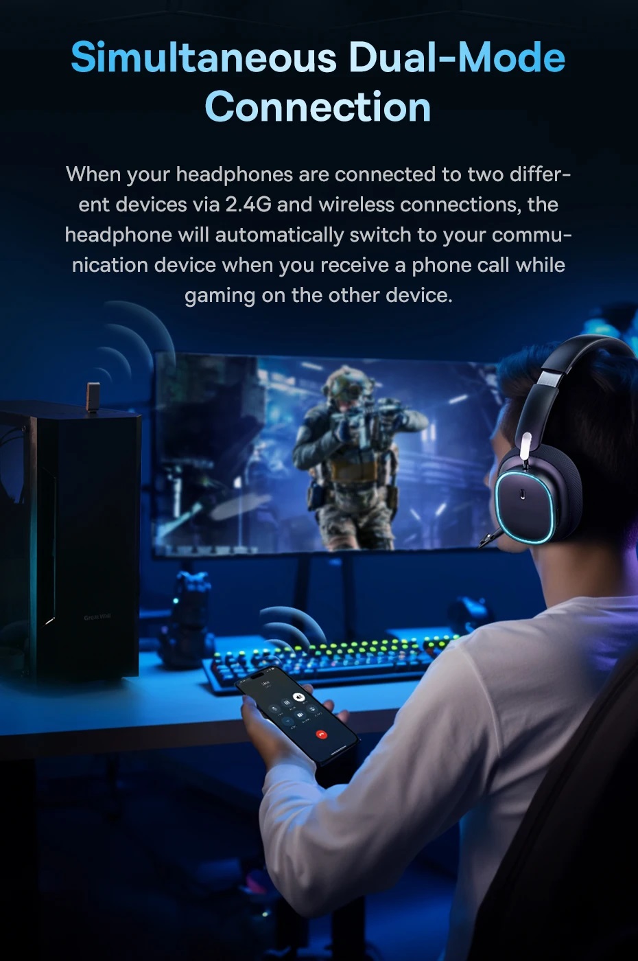 •  Triple Connectivity Modes: 2.4GHz, Wireless, and Wired