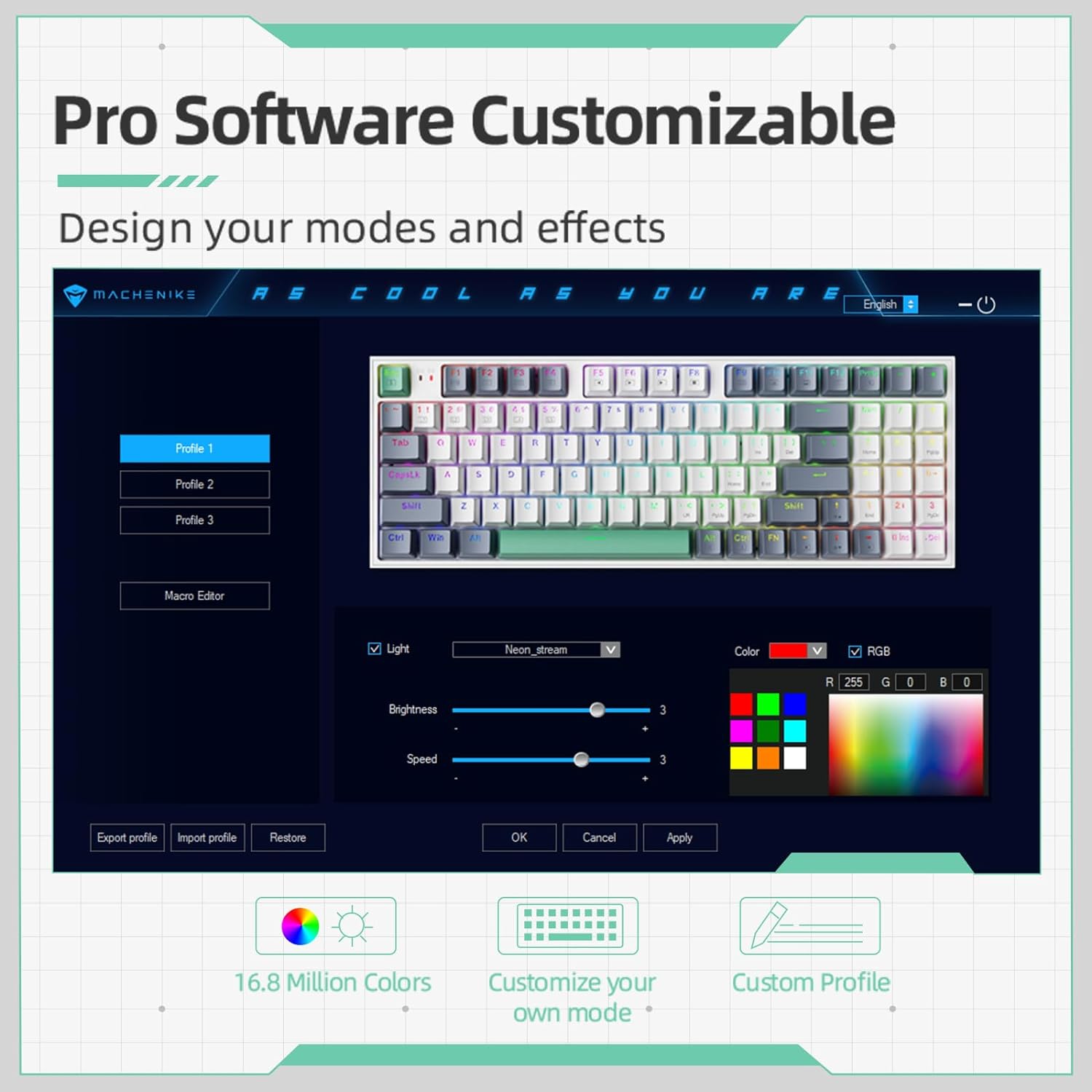 Extremely Cool RGB Backlit MACHENIKE K500-B94 Keyboards come with an adjustable RGB dynamic backlit system, which is supporting 20 different backlit modes and custom modes.