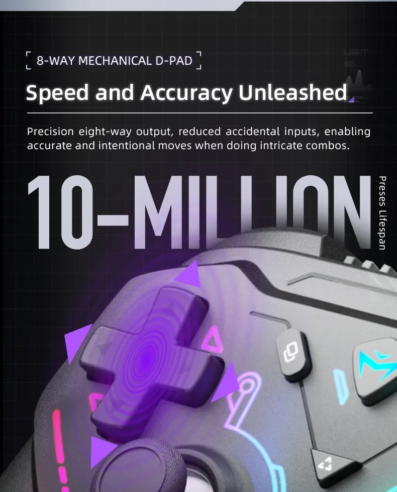 Mechanical D-pad for precise directional press, accurate 8-way control for perfect moves, smooth combo execution, and a 10 million operation lifespan. Precision-engineered for the ultimate gaming experience.