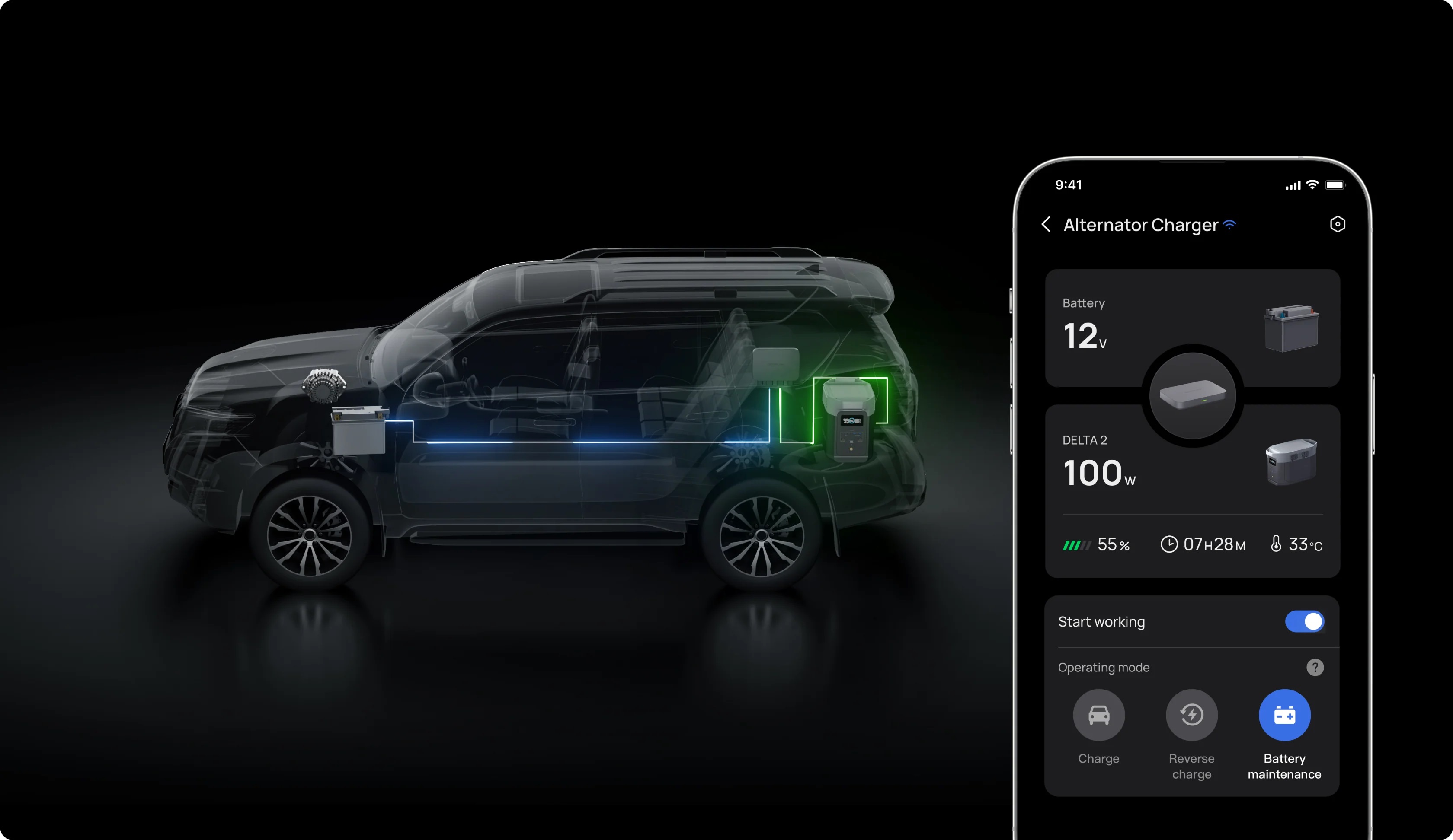 • 800W turbo alternator, 8× faster than traditional in-vehicle auxiliary power outlets. Top up 1kWh in only 1.3 hours