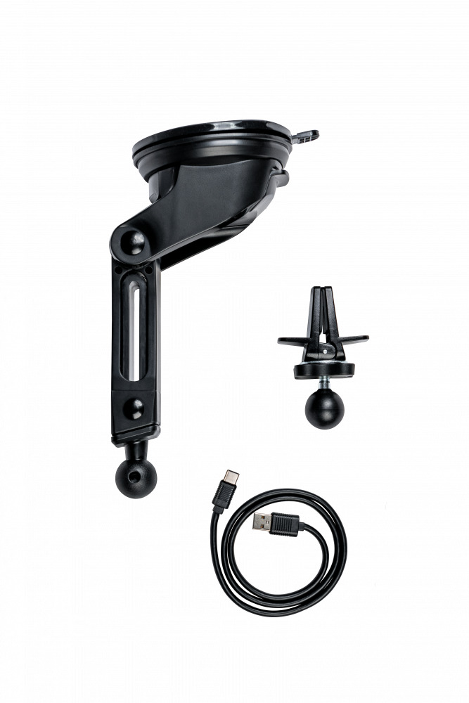 - Three mounting options: vent holder, suction cup on dashboard, or front window
