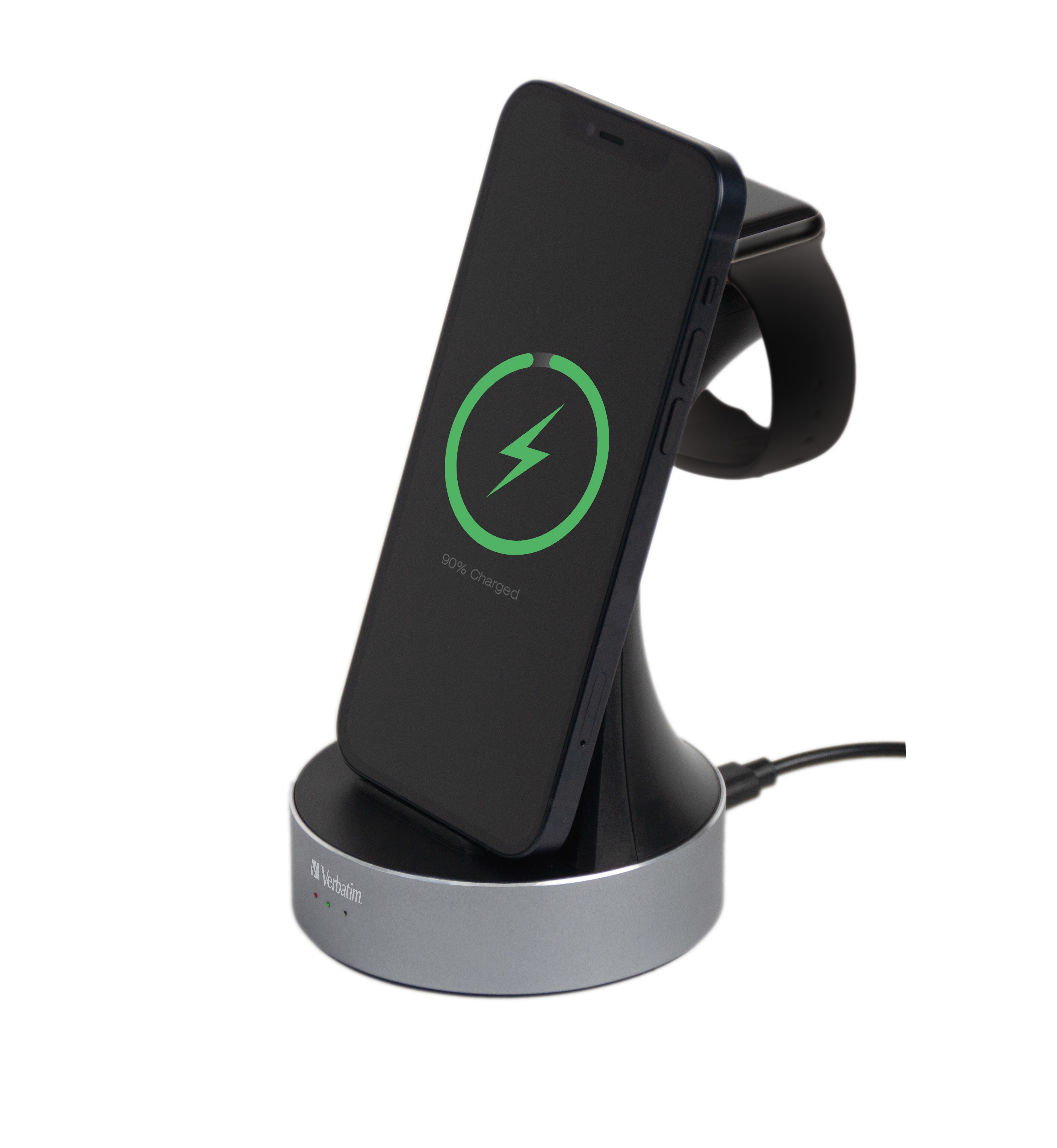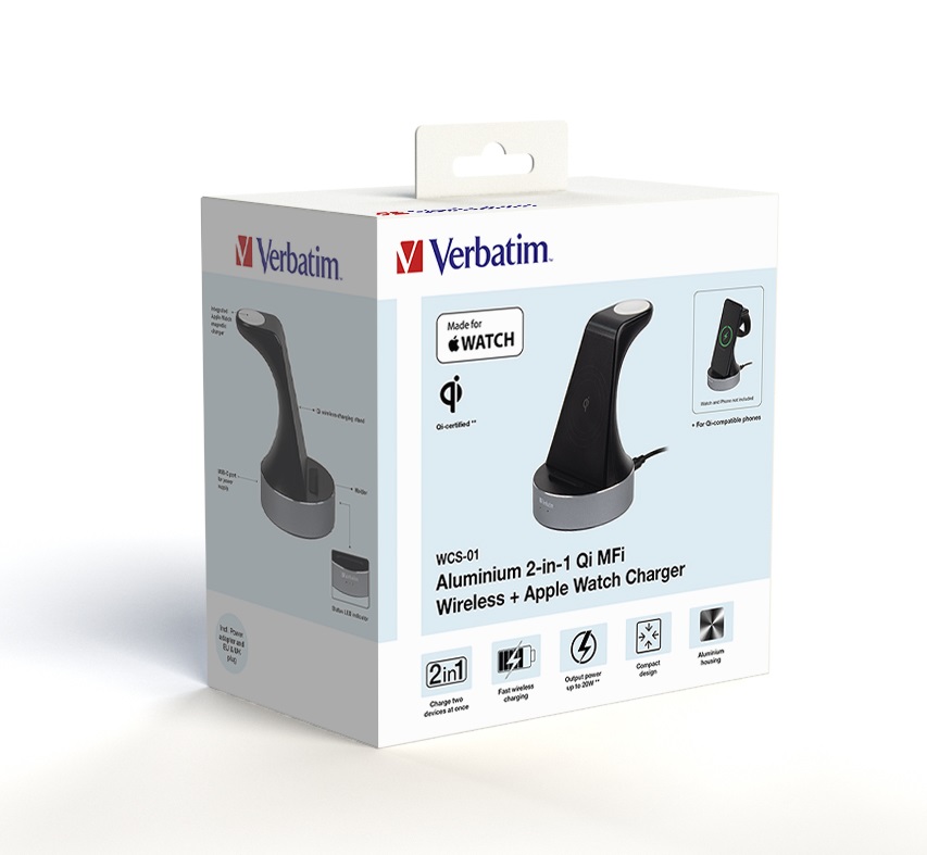 Charge your Apple Watch and iPhone (8 or later) or other Qi-certified wireless charging enabled device with Verbatim’s 2-in-1 charging station