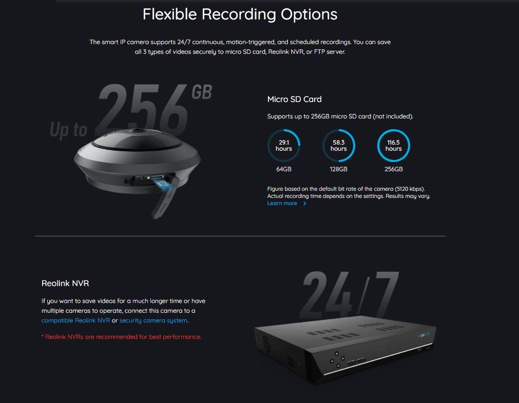 Flexible Recording Options : The smart IP camera supports 24/7 continuous, motion-triggered, and scheduled recordings. You can save all 3 types of videos securely to micro SD card, Reolink NVR, or FTP server