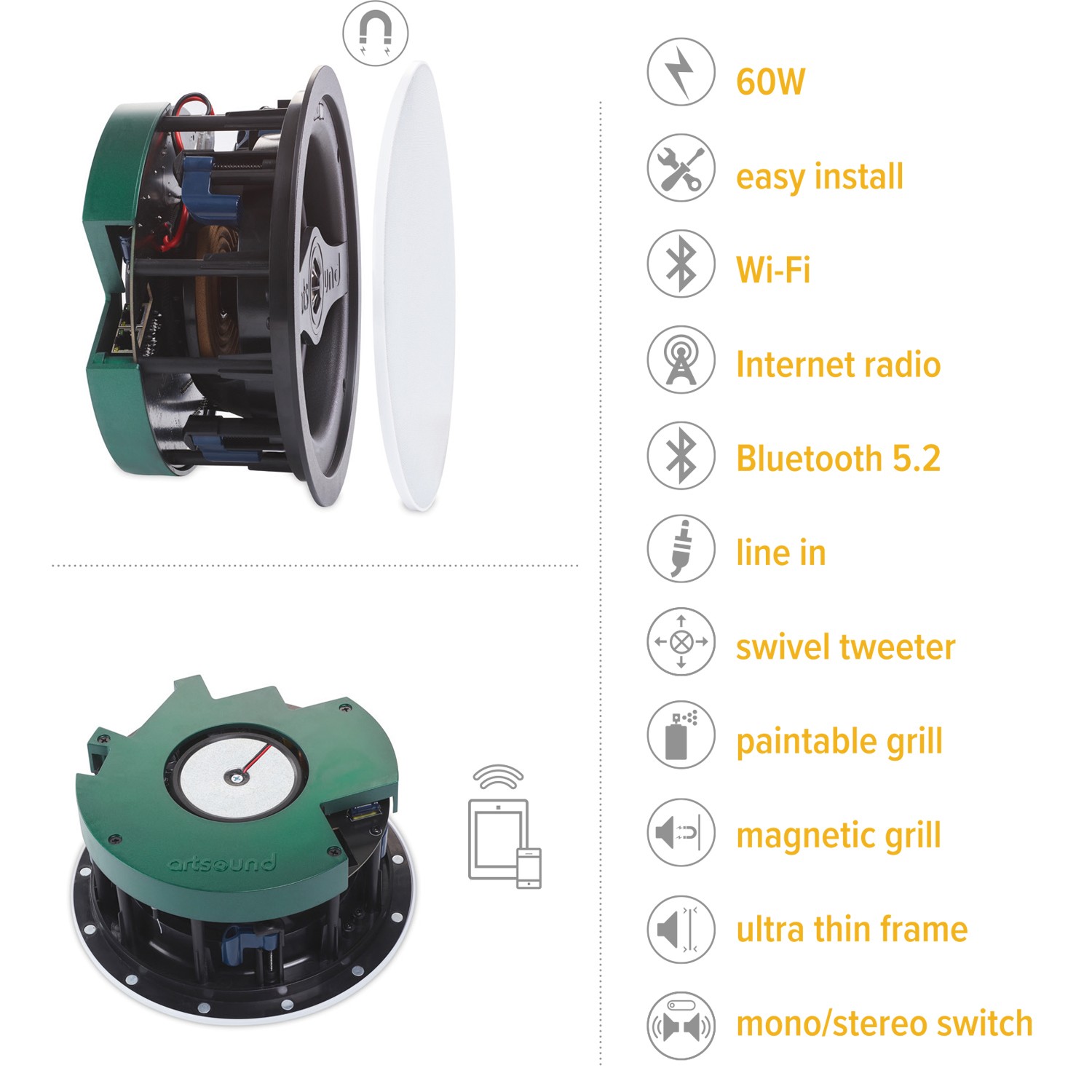 • The ArtSound SMART IN is an active streaming multiroom in-ceiling speaker.