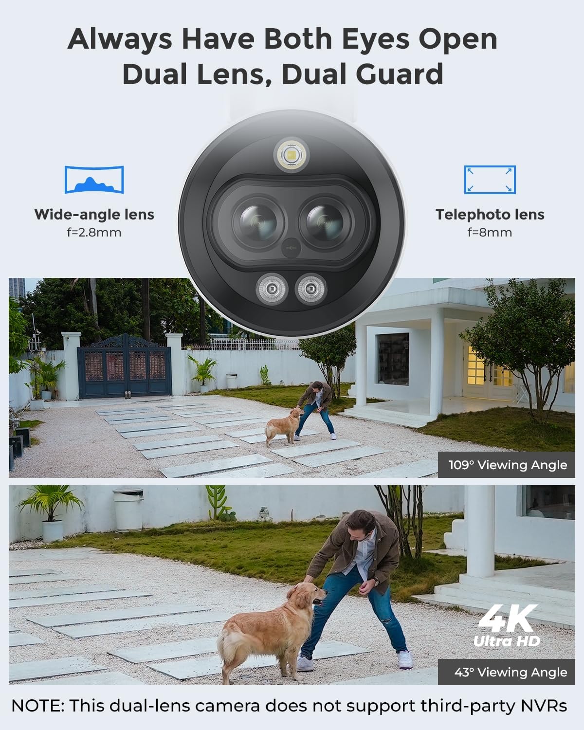 Dual Lens, Dual View - Got two lenses with one-time installation. With a 109° panoramic view captured by the wide-angle lens and a close-up view by the telephoto lens, the camera protects what you care most without losing sight of any corner. You can check the two images at one glance as they are displayed on one screen