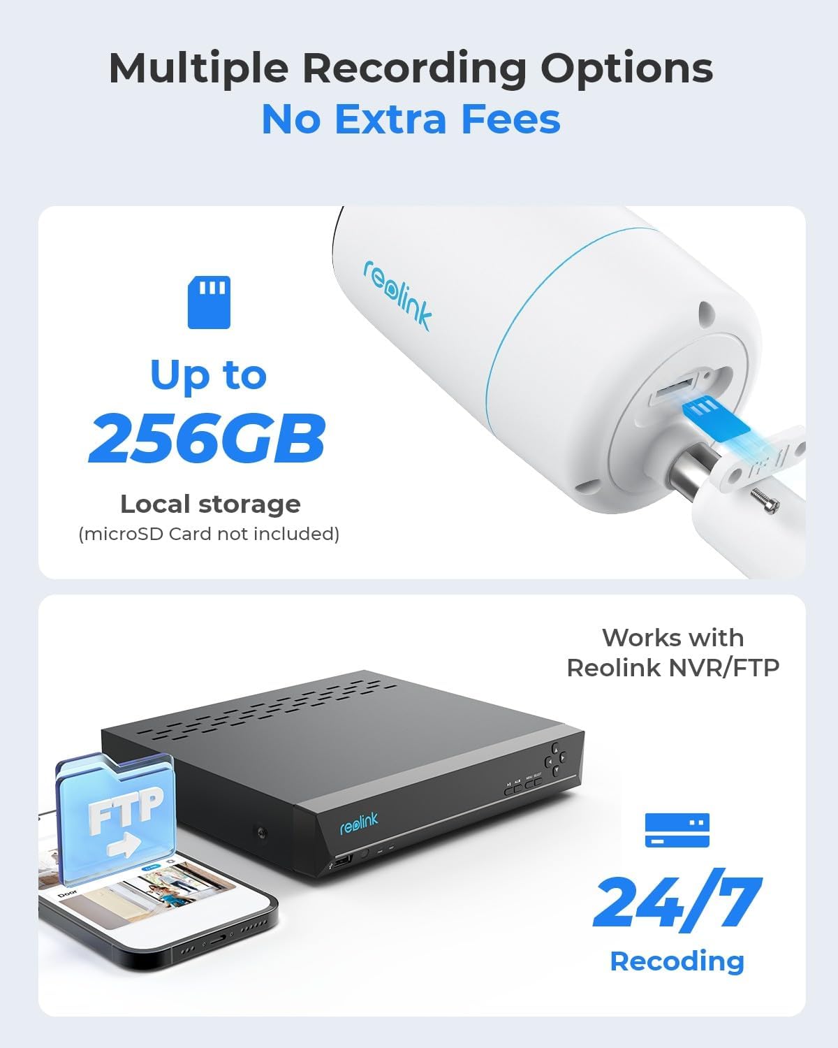 Flexible Storage Options - P330M supports 24/7 continuous, motion-triggered or scheduled recording. It can be saved to microSD card, Reolink NVR or FTP server. Choose a way you like and enjoy customized security