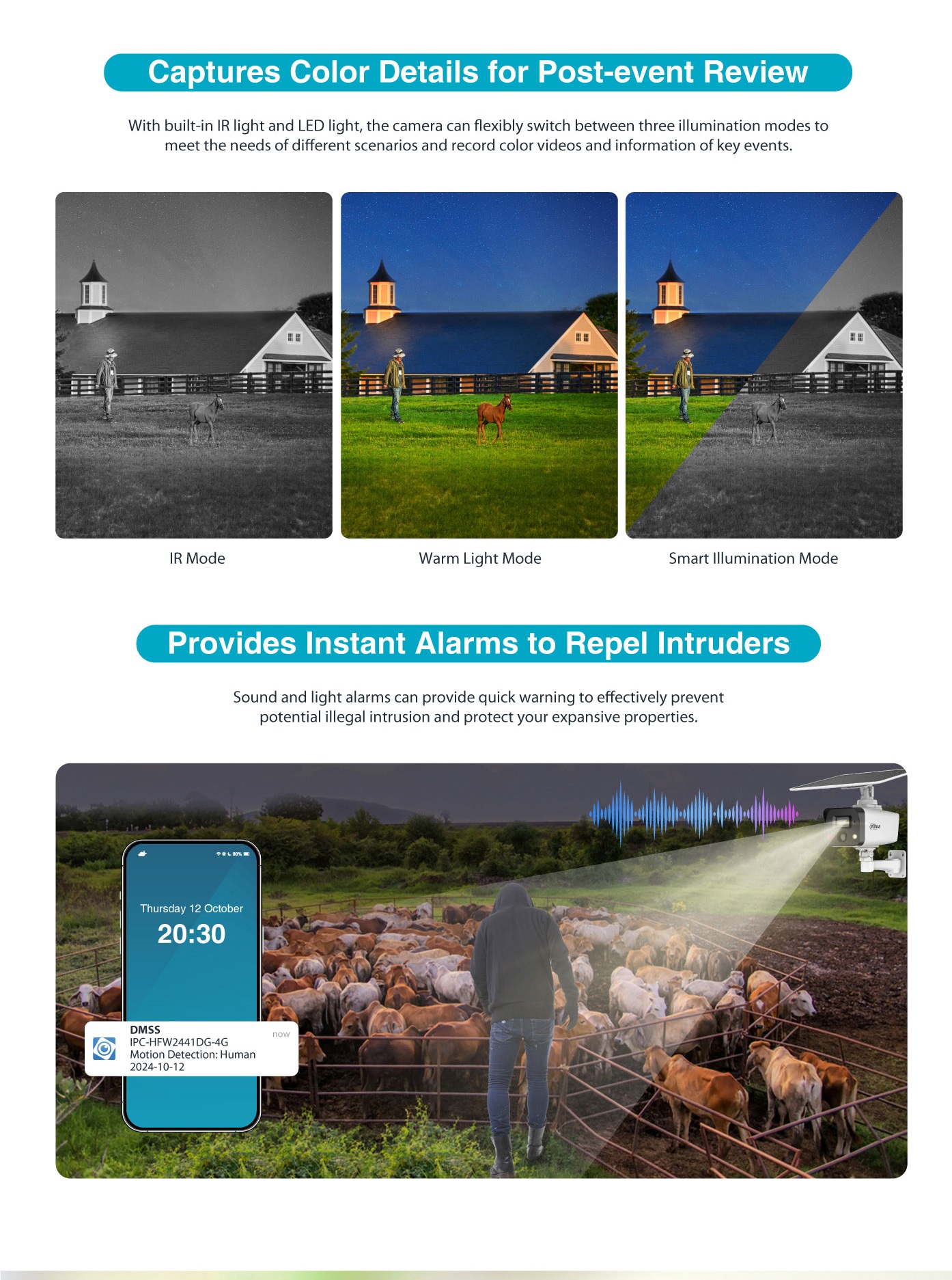 Built-in warm light and IR LED, the max. IR distance is 30 m and the max. warm light distance is 20 m