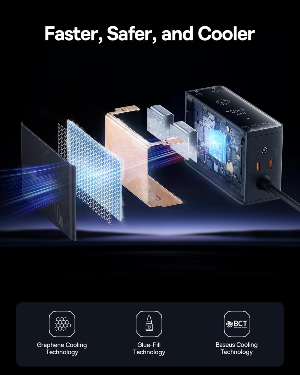 Intelligent Core with Extensive Safety: Invest in an upgraded Baseus chip with advanced cooling technology that uses glue-fill techniques and Graphene to ensure lasting power while 9 protective charging protocols make your experience faster, safer, and cooler.