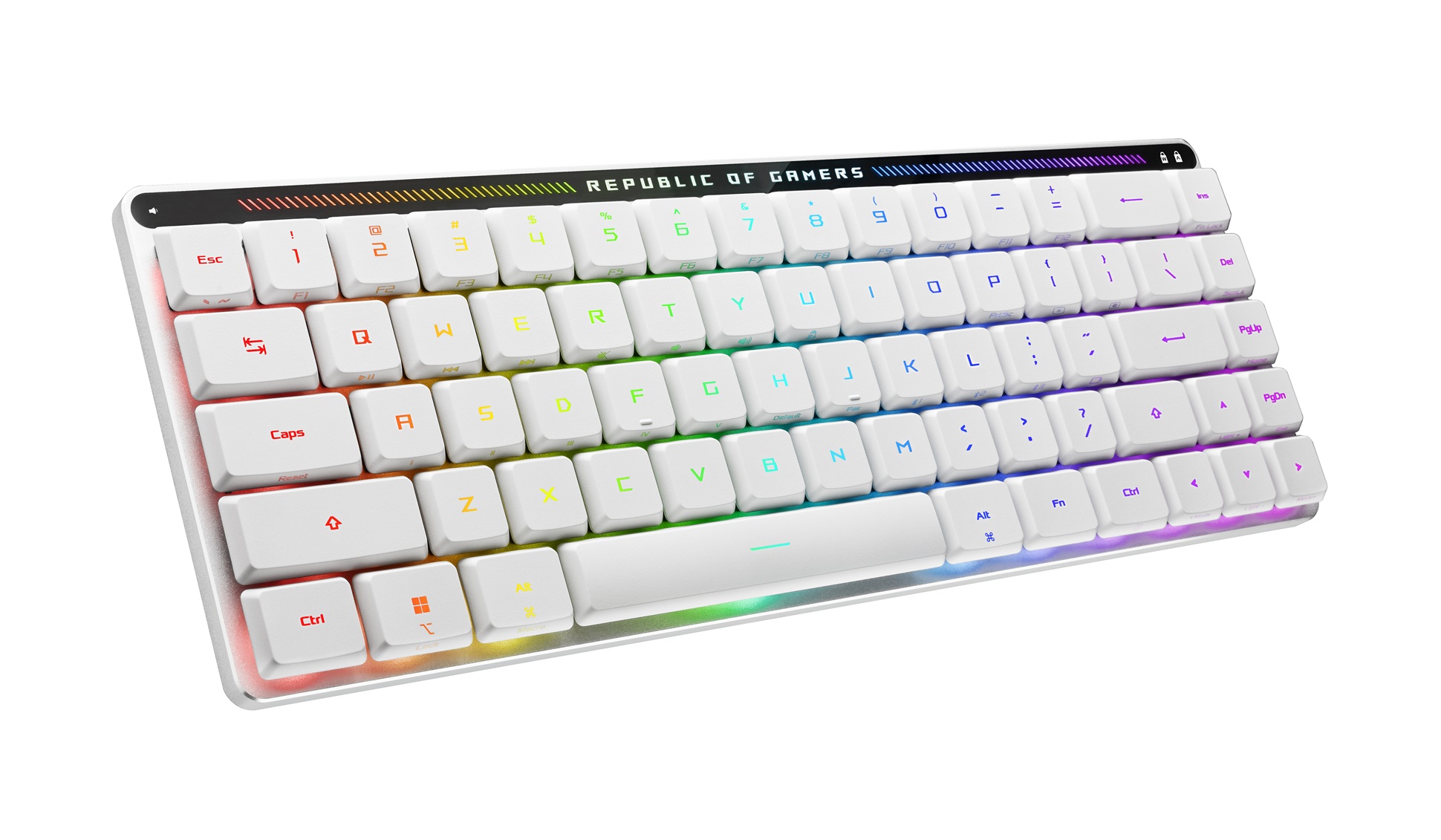 ROG Falchion RX Low Profile 65% compact wireless gaming keyboard with ROG RX low-profile optical switches, tri-mode connection with ROG SpeedNova wireless technology and Omni Receiver, protective cover, integrated silicone dampening foam, interactive touch panel, and MacOS support