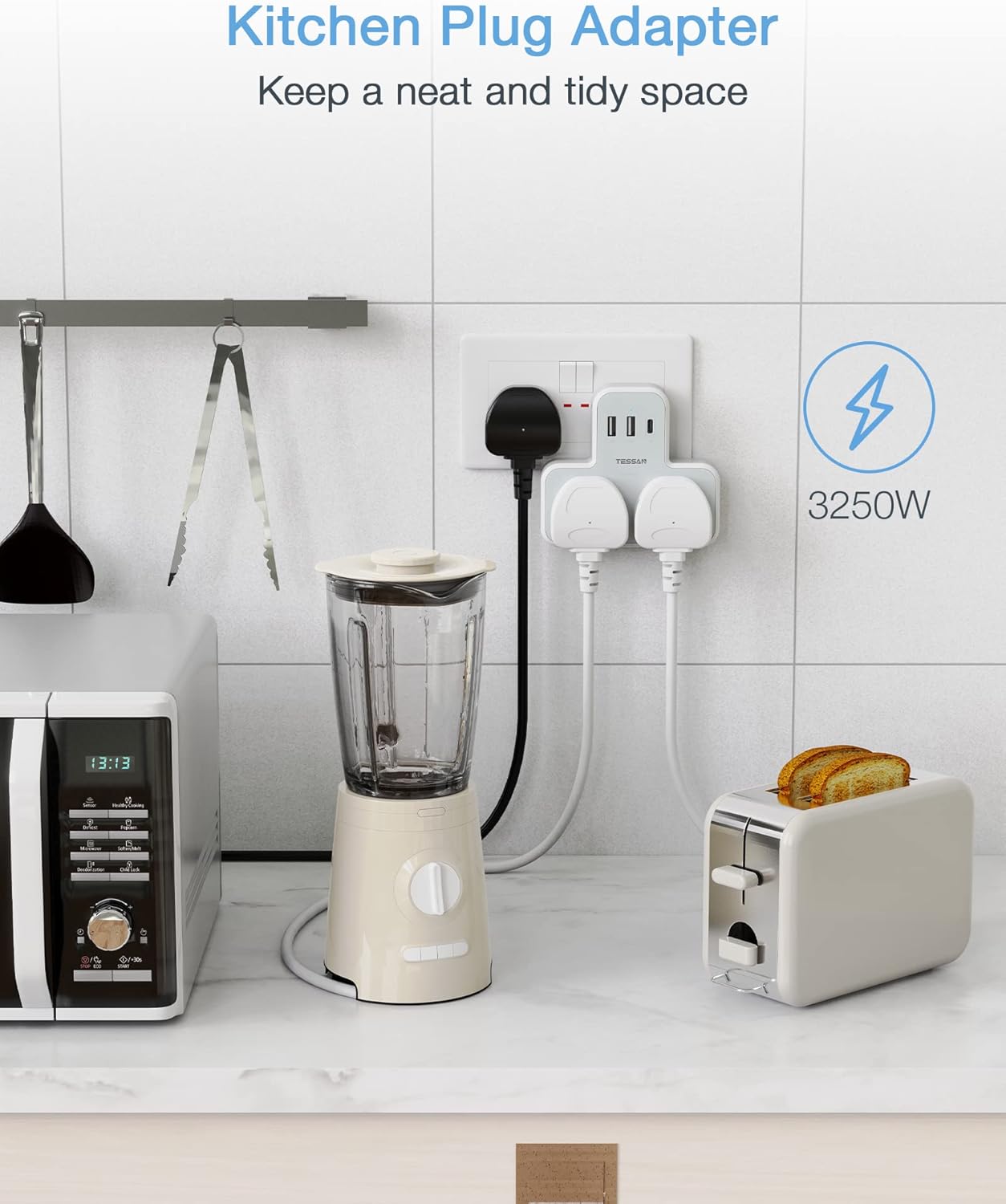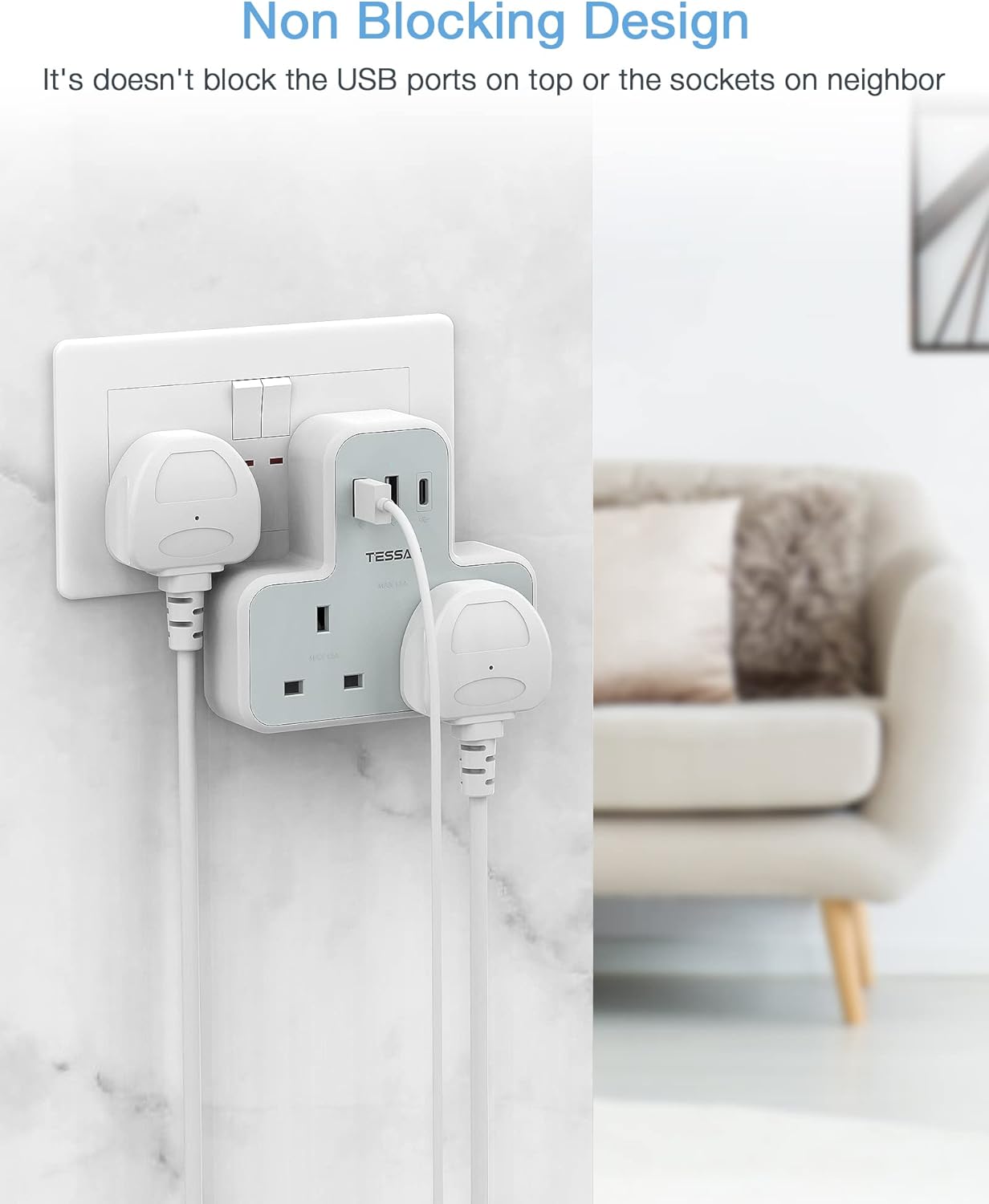 5 in 1 Multi Plug This double plug features 2 grounded AC sockets, 1 USB C plug and 2 USB plug, ideal for charging indoors without bulky extension cords. 1 extension plug turns to 5 electronic devices