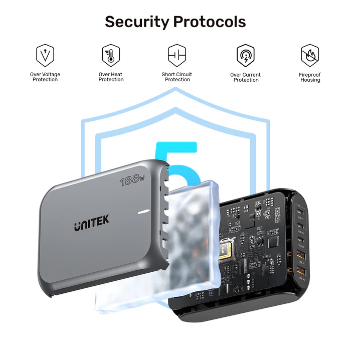 Elevate your charging experience with the UNITEK 188W PD3.1 Desktop GaN Charging Station, featuring the latest GaN technology for unmatched efficiency. Delivering up to 188W, this powerful station is capable of fast charging your devices, including the MacBook Pro.