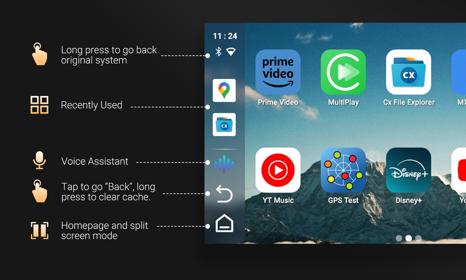 The CA480 supports three systems: Apple CarPlay, Android Auto, and a Custom Android system. This versatile compatibility ensures seamless integration with various devices, enhancing connectivity and user experience.