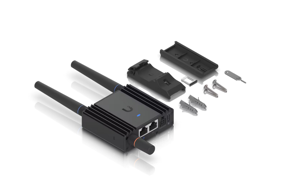 The Ubiquiti Mobile Router Ultra is a wireless router supporting Wi-Fi 4 in the 2.4 GHz band, including IEEE 802.11 b/g/n protocols. The maximum theoretical wireless connection throughput is 150 Mbps (SISO). The device features an integrated LTE Cat. 4 modem, with a theoretical download speed of 150 Mbps and an upload speed of 50 Mbps. The router includes 2 Fast Ethernet ports (10/100 Mbps), consisting of 1 WAN port and 1 Passthrough/LAN port. It supports automatic failover (switching in case of connection failure) between LTE, WAN, and Wi-Fi. The package includes 3 external antennas: the mobile antennas have SMA connectors, while the Wi-Fi antenna has an RP-SMA connector. If needed, the antennas can be replaced with more powerful ones. The manufacturer has designed the device with a durable polycarbonate and aluminum casing, capable of operating in a wide temperature range from -30 to 70°C. Using the included mount, you can install the router on a wall or a DIN rail. Power can be supplied via a USB-C port or a 4-pin DC connector, though no power adapter is included in the package. This product is an excellent solution for various IoT connections, especially in challenging locations where standard connections are unavailable, thanks to its LTE modem. The failover function ensures uninterrupted operation, while site-to-site VPN and VPN client support allow the router to connect to the main network.