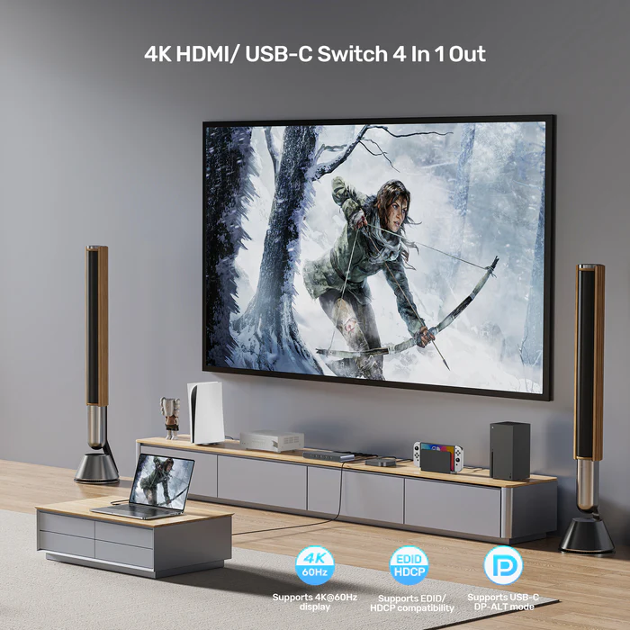 UNITEK 4K HDMI/USB-C Switch 4-in-1 Out connects gaming consoles, tablets, phones, and laptops to one TV port. Seamlessly switch between PC screens, movies, games, and shows without unplugging HDMI cables. Supports desktop PC, laptop, smartphone, and iPad.