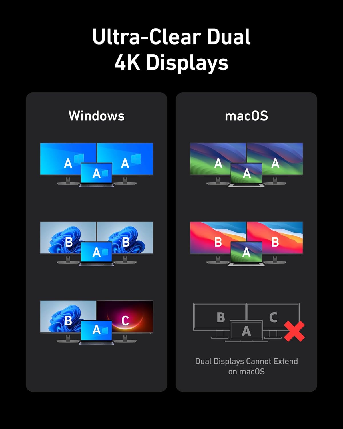 • Compatibility: Supports USB-C, USB4, and Thunderbolt connections. Compatible with MacBook (macOS 12 and later), Windows 10 and 11, ChromeOS, and laptops that support DP Alt Mode and Power Delivery. Note: This device is not compatible with Linux.