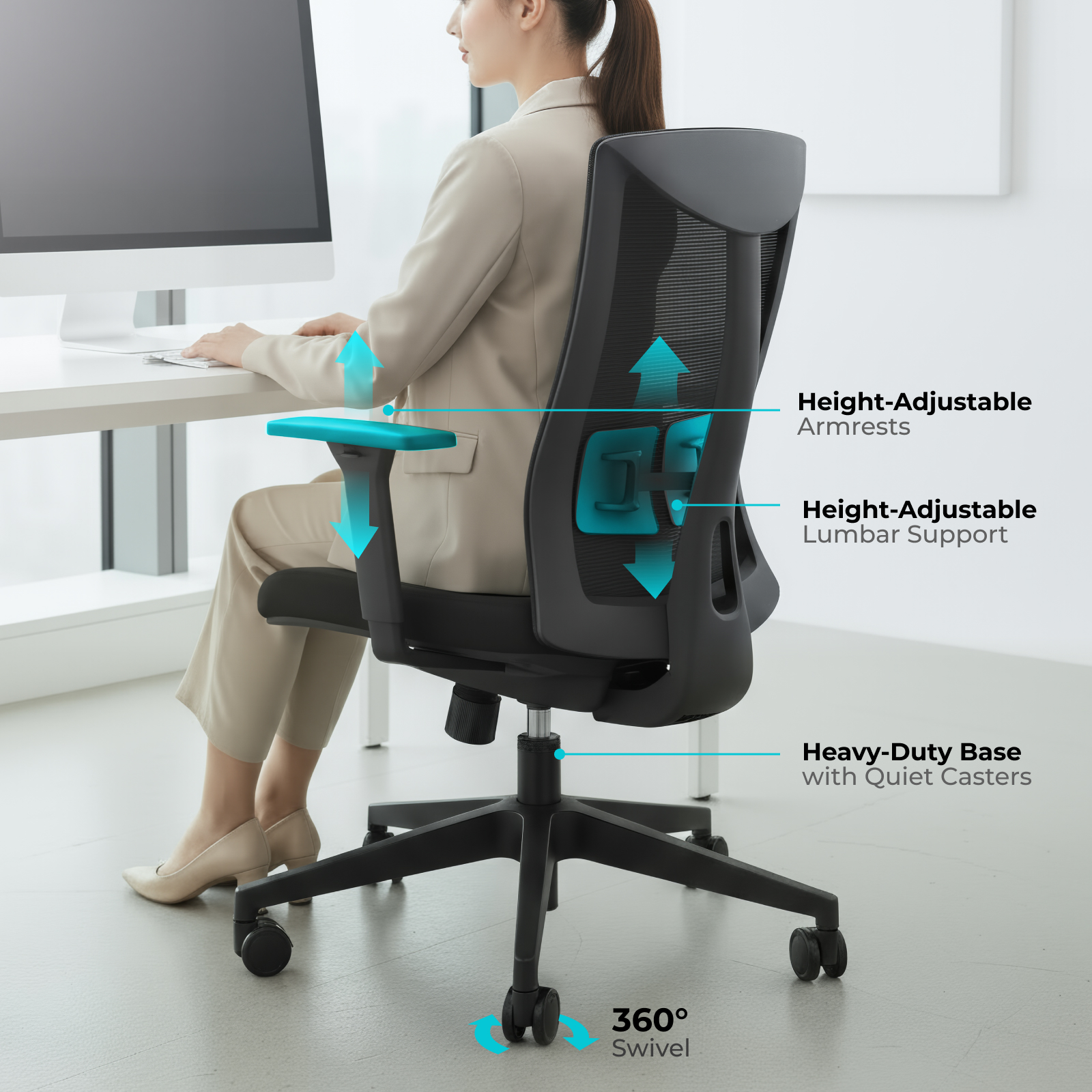 - Adjustable Lumbar Support: alleviates lower back pain during long periods of sitting