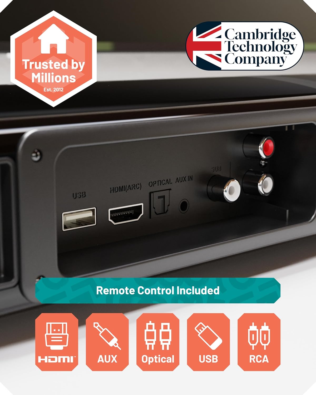 • 𝗛𝗗𝗠𝗜 𝗔𝗥𝗖, 𝗢𝗣𝗧𝗜𝗖𝗔𝗟, 𝗔𝗨𝗫 & 𝗨𝗦𝗕 – Connect to your TV, console, PC or music player with multiple inputs. USB port supports playback only (MP3, FLAC, WAV) from drives up to 64GB.
