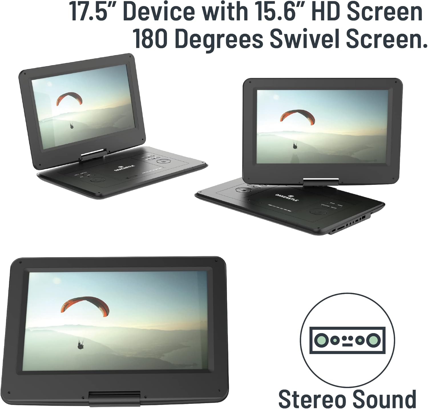 2.0 STEREO, MULTI-SCREEN SETUP: Connect multiple DVD players for multi-user viewing or use with a TV or projector. for a shared experience. Additionally, enjoy crystal-clear audio through 2.0 stereo speakers or immersive headphones via the 3.5mm jack.