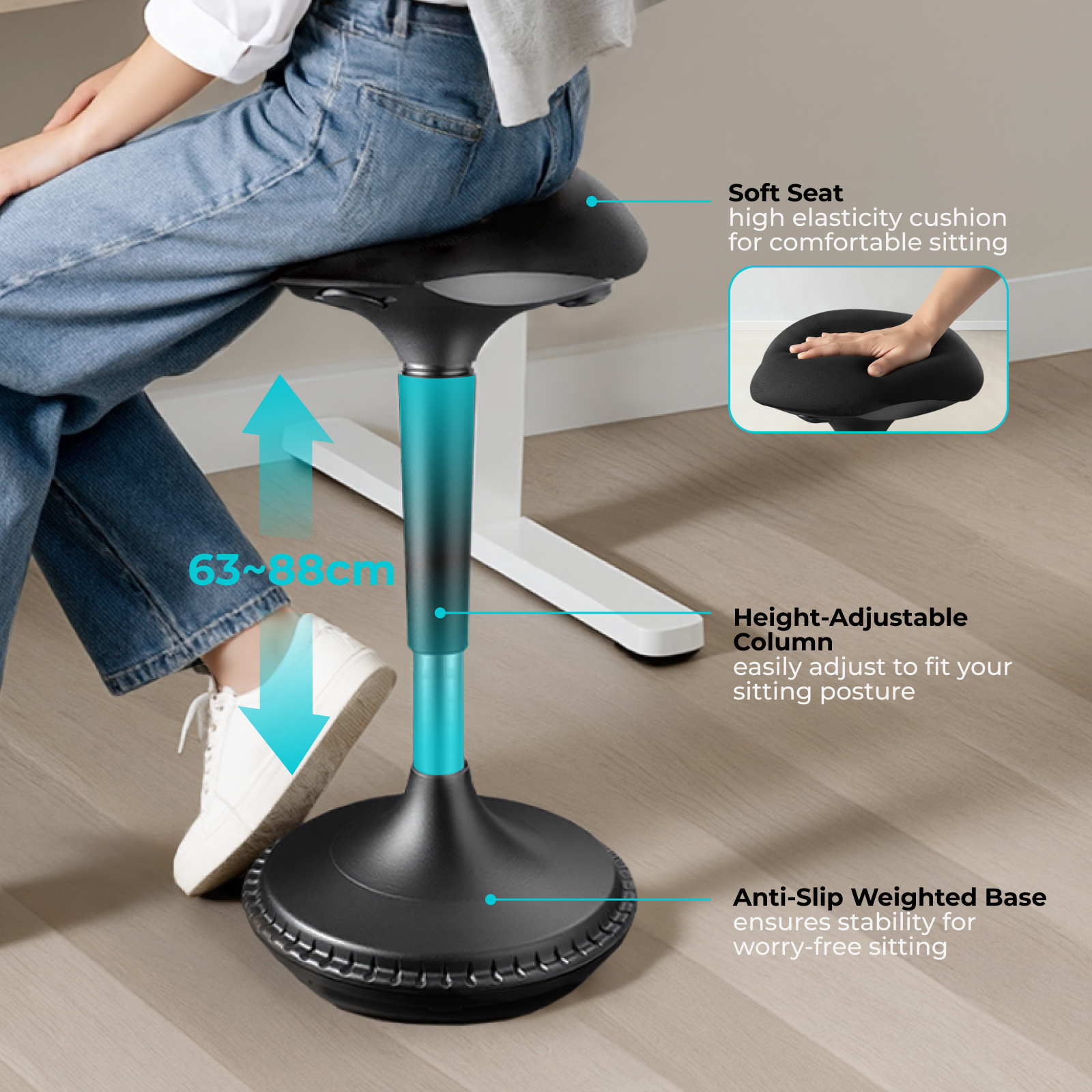 The ergonomic stool creates a dynamic, healthier, and innovative way of sitting which makes sitting more fun and enjoyable. A built-in gas spring allows you to stand up with little effort. The stool accommodates various heights while reducing fatigue and strain on legs while using a standing desk. With a tip-free base, the Wobble Stool offers the user a solid yet movable seat, guaranteed to provide you with the most modern and comfortable seat! Start wobbling today!