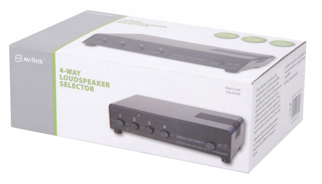 This switcher unit allows the distribution of a stereo amplifier. Simply connect the output of an amplifier to the box, this output can then be distributed to up to four different stereo speaker sets in four different locations, each speaker set can be individually activated via the push buttons on the front of the box. Ideally suited for buildings where an independent sound control is required for different rooms or zones.